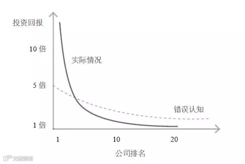 但是“撒网式投资,然后祈祷”这种方法通常会全盘皆输。这是因为风险投资的回报并不遵循正态分布,而是遵循幂次法则:一小部分公司完胜其他所有公司。如果你看重撒大网,而不是把注意力放在仅仅几个日后价值势不可当的公司,一开始你就会与这些稀有公司失之交臂。图2清楚地展现出现实和错误认知之间的差异。