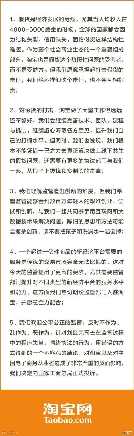 淘宝最后表示,反对不作为、乱作为、恶作为。针对刘红亮司长在监管过程中的程序失当、情绪执法的行为,用错误的方式得到的一个不客观的结论,对淘宝以及对中国电子商务从业者造成了非常严重的负面影响,“我们决定向国家工商总局正式投诉。”