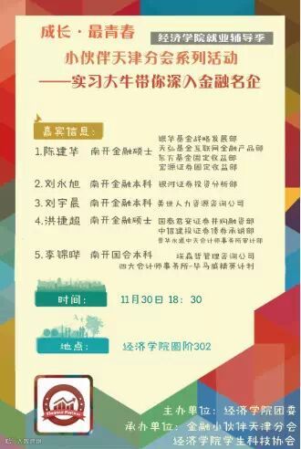 “金融小伙伴”携手经院团委,邀请基金,证券,咨询,四大等行业实习牛人会聚天津,拨开金融名企实习的层层迷雾,圆小伙伴们的金融梦。