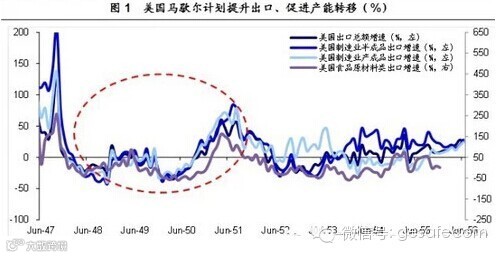 马歇尔计划实施后,美国制造业出口增速显着回升。受欧洲经济下滑拖累,美国制造业出口增速自1947年10月起失速下滑。而在马歇尔计划启动半年后,美国出口增速触底反弹,并在整个计划实施期间不断走高。