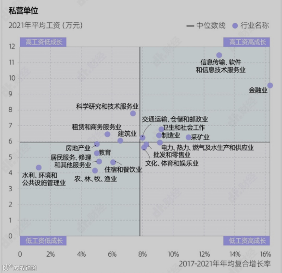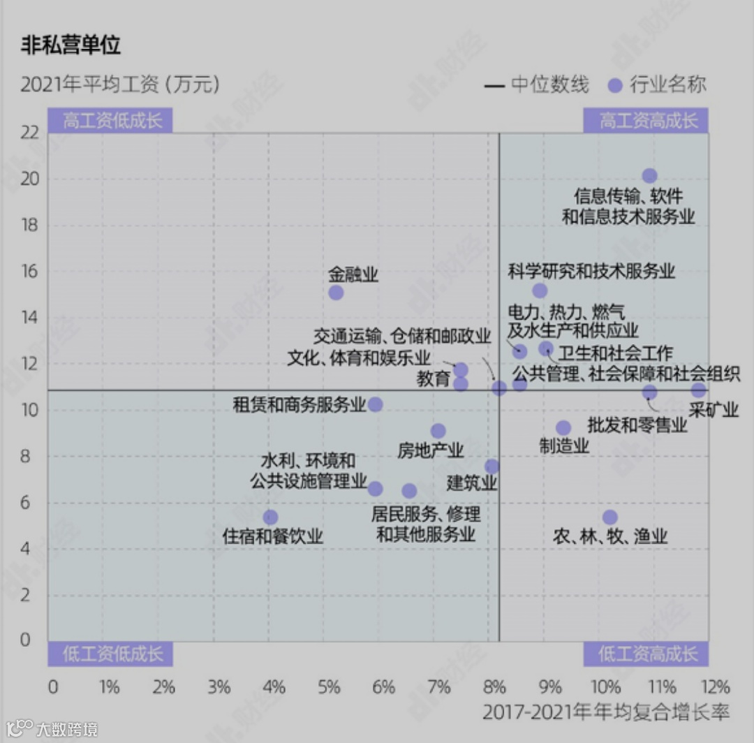 在私营单位中,“金融业”、“制造业”、“采矿业”和“交通运输、仓储和邮政业”进入高工资高成长行列。