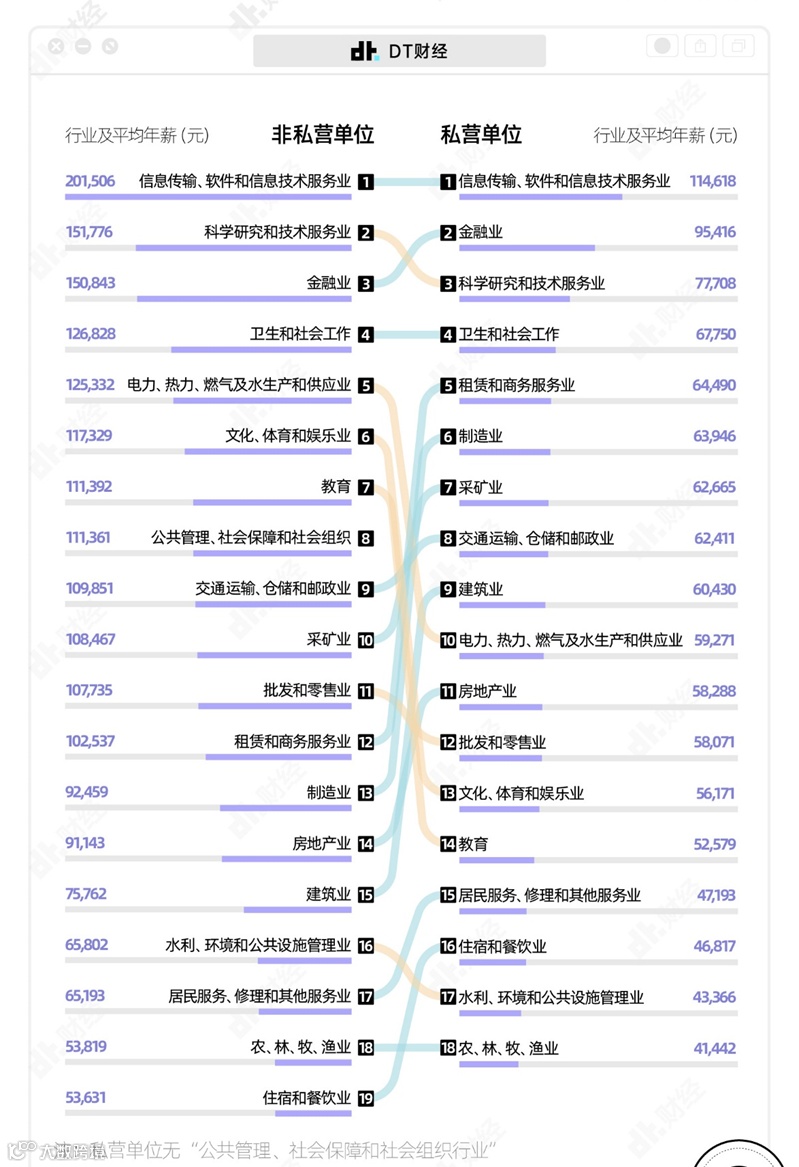 一是“科学研究与技术服务业”,在非私营单位和私营单位的平均年薪分别排名第二、第三。