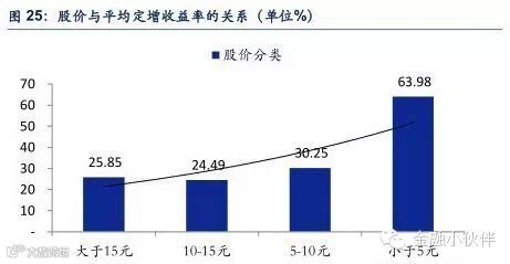 同样对于绝对股价较低的公司有类似现象,我们会发现股价越低的上市公司定增收益率越高;其中,股价低于 5 元的定增收益率会显著高于其他。