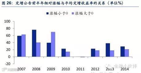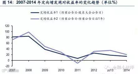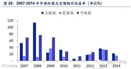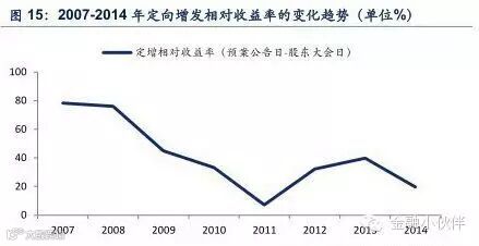 2007-2014 年,将将定增预案公告日至证监会批准日期间市场环境分为上涨市、震荡市和下跌市(其对应的定增收益率分别为 47.5%、26.2%、47.7%;在市场下跌过程中购买定增股将能获得更高的相对收益率。