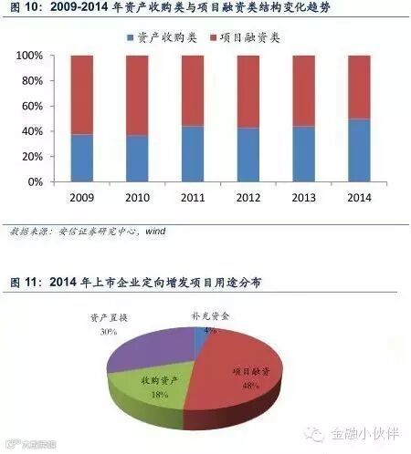2009-2014 年,资产收购类定增行为占比上升约 10 个百分点;而项目融资类定增行为下降约 14 个百分点。(统计未包含引入战略投资者类定增行为,2014 年,引入战略投资者定增行为占比 3.9%)2014 年发布定增预案的上市公司当中,项目融资类和资产收购置换类各占半壁江山,所占比例分别为 48%和 30%。