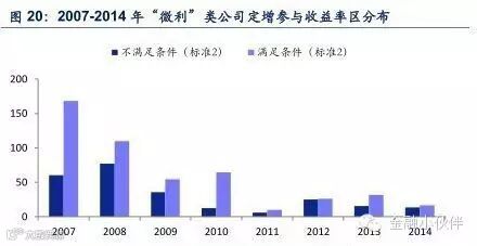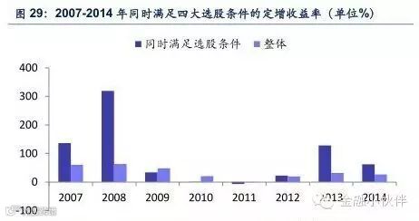 假设同时满足上述选股条件,2007-2014 年共有 66 次定向增发符合条件,占比 3.5%。综合来看,同时满足选股条件的平均定增收益率为 83.48%,较整体定增收益率 31.85%;