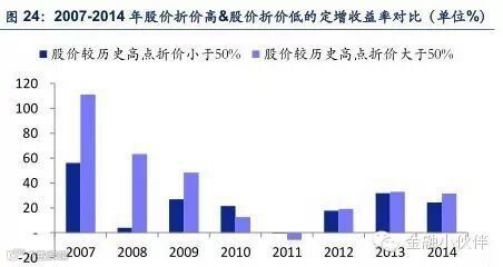 2007-2014年数据显示,股价较历史高点折价率高于50%的上市公司定增收益率32.5%,比较折价率低于 50%的定增收益率 25.5%;略高 7 个百分点。其中,从时间来看,2007-2009年折价高的上市公司定增收益率表现尤为显著。