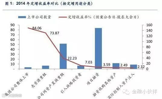 根据定增资金用途分类,2014 年集团整体上市的最受市场追捧,平均定增收益率高达 84%,其次为用于壳资源重组的上市公司定增收益率 73.87%。而定增资金用于融资收购其他资产、及实际控制人资产注入定增预案公告后相对落后。