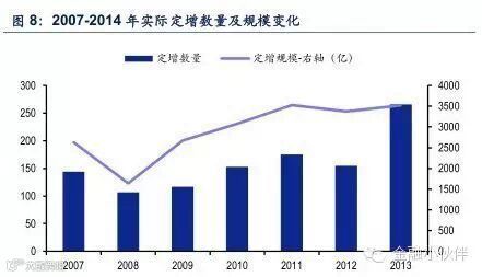 2007-2014 年实际完成定增数量为 1300 次,实际募集资金总额 2.34 万亿;实际定增数量及规模均呈现快速上升。