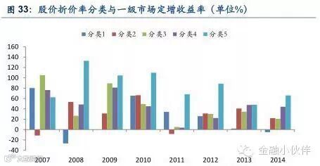 比较2007-2014年各类的一级市场定增收益率,分类1-分类5依次为17.6%、21.9%、33.7%、44.4%、74.4%;历史最高股价折价越多,一级市场定增收益率越高。