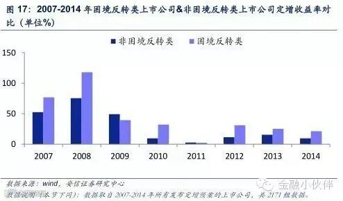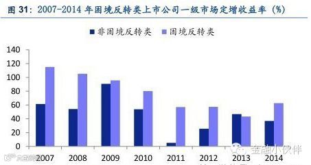 根据 2007-2014 年定增数据,(金融小伙伴)困境反转类上市公司平均定增收益率为 36.7%,非困境反转类上市公司平均定增收益率 29%;困境反转类上市公司定增收益率高出 7.7 个百分点。