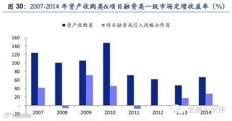根据被收购资产所属行业是否属于新兴产业,分为“新兴产业收购”与“传统产业收购”,其中,“新兴产业收购”收益率远高于“传统产业收购”。根据 2014 年 6 月的定向增发项目数据:当月共披露资产收购类定增项目 26 个,其中,严格意义上的跨界收购仅 5 个,包括丹甫股份臵入核电资产、申科股份臵入影视资产、凯撒股份购入网游资产、道博股份购入传媒资产、天润控股购入网游资产。截止 7月,上述 5 个项目平均收益率122.4%,其中 2 个项目定增收益率超过 200%;而同期 26个资产收益率项目的平均定增收益率仅 40%;跨界收购收益率远高于同行业并购(含产业链上下游延伸)。