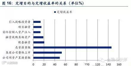 根据定增用途,(金融小伙伴)项目可以分为公司间资产臵换、集团公司整体上市、壳资源重组、配套融资、融资收购其他资产、实际控制人资产注入、项目融资、引入战略投资者等 8个主要内容;其中,前 6 大类可以归结为资产收购类定增项目,后 2 类或可归结为项目融资类定增项目。