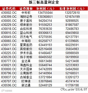 其中中科软(430002.OC)连续两年盈利过亿(2012年净利润11124万元),作为专门从事算机软件研发、应用、服务的智能密集型高新技术企业,其在系统软件、支撑软件、建筑智能化工程、行业应用软件等各个层次均表现出强大的竞争力。正确的战略方针、高水平的工作团队、强大的创新能力为中科软带来了丰厚的利润回报。湘财证券(430399.OC)是国内第一家登陆新三板的券商,其登陆新三板为券商发展融资、制定新的战略方针开辟了新的道路。