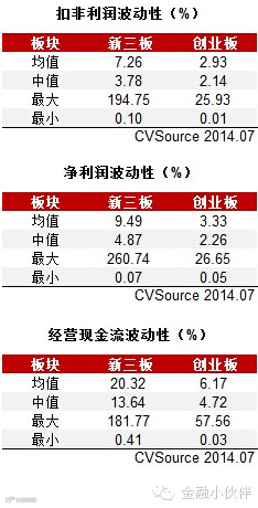 相较于新三板,创业板企业2013年亏损20家,(微信号:jrxhb2014)约占创业板企业总数1/19。连续2年亏损3家。净利润波动性、扣非利润波动性、经营现金流波动性方面,新三板企业均高于创业板。从扣非净利润波动性、净利润波动性和现金流量波动性来看,新三板企业在盈利能力和经营能力方面所面临的的风险明显较高。虽然其盈利能力强、增速高,但业绩分化大,波动性较大。