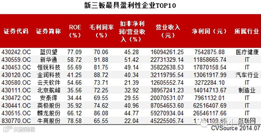 高盈利性是新三板企业重大优势。通过比对近三年的ROE、毛利润率、净利润率等盈利性指标与资产、营业收入等规模(微信号:jrxhb2014)性指标以及 P/E、P/B等值,筛选出十家新三板挂牌企业:他们规模较小,但盈利水平较高且稳定。
