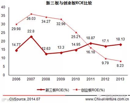 2013年新三板所有企业毛利润率均值为50.47%,其净利润率均值和扣非利润率均值分别为14.30%和2.80%,EPS均值为0.28/股。ROE为18.13%,远高于创业板的7.28%。高盈利性使新三板成为目前投资机构关注的焦点。