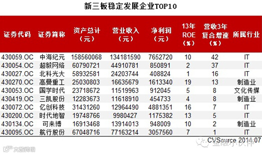 通过对CVSource投中数据终端的新三板企业财报分析,不难发现有些挂牌新三板的企业近些年来保持稳中有增的发展态势。综合考虑近三年ROE、净利润和营业收入的变动情况,按照其波动性进行综合排序,我们挑选了近3年发展稳中有增的十家企业。