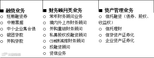 各个银行因为架构的不同,业务类型应该有不小差异的,就像前一段时间试点推出的债权直接融资工具和银行资管计划,不同的银行将这个业务放在了私人银行部、金融市场部、投行部。所以我只是简单介绍一下狭义上银行的投行部大概的业务种类。其实不同的融资工具,简单来看只是形式不同,根本上来说银行做的还是债权类融资,目前银行由借款类业务向投资业务转变,还需要一个不短的过程吧。