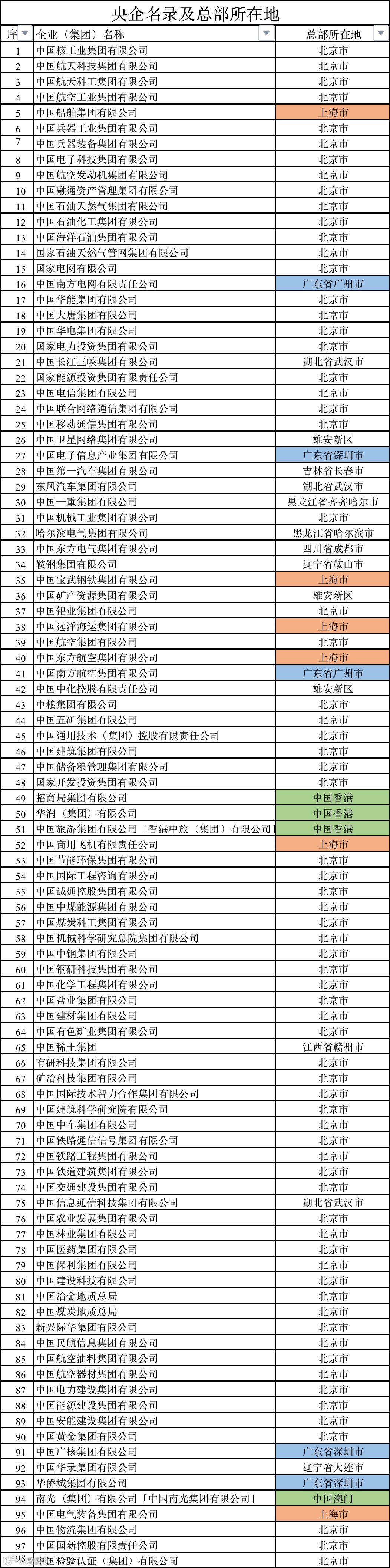 广州:中国南方电网有限责任公司(名录第16,简称南网)、中国南方航空集团有限公司(名录第41,简称南航)