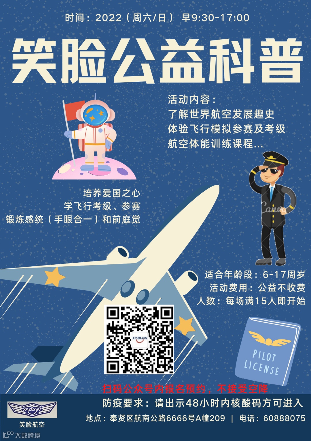 本周六/日(2022年9月3日)笑脸航空将举办(疫情后)第二十一场航空公益科普活动,活动安排如下: