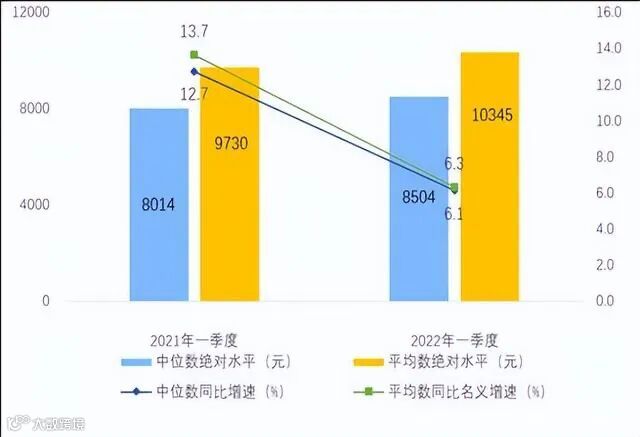 再来看看今年的数据,2022年第一季度,全国居民累计人均可支配收入为10345元,累计增长5.1%,增长率比上年同期下降8.6个百分点。