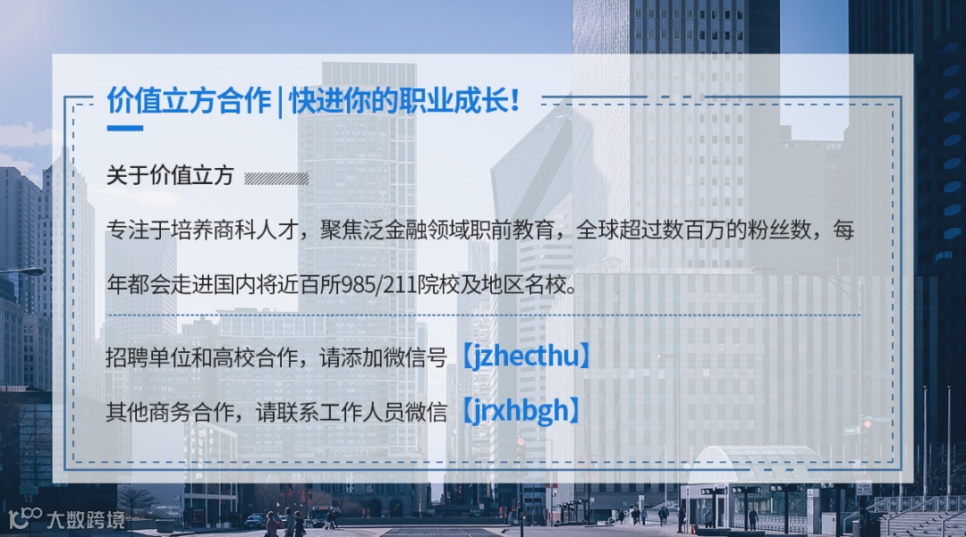 金融小伙伴致力于搭建一个金融垂直领域职业信息分享和交流公益平台,通过持续不断的公众号推文和线上线下活动,提供及时、全面、高效的行业招聘信息和职场提升经验。目前,我们已吸引了超过100万粉丝,在海内外金融学子和在职人士中均享有盛誉。