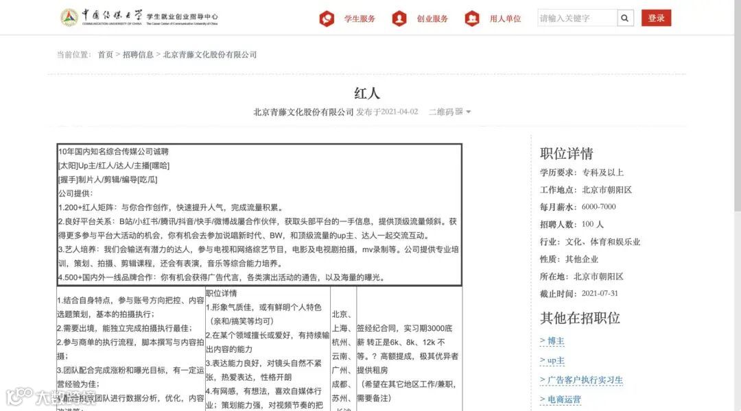 中国传媒大学就业信息网站上,青藤文化发布的“红人”岗位需求