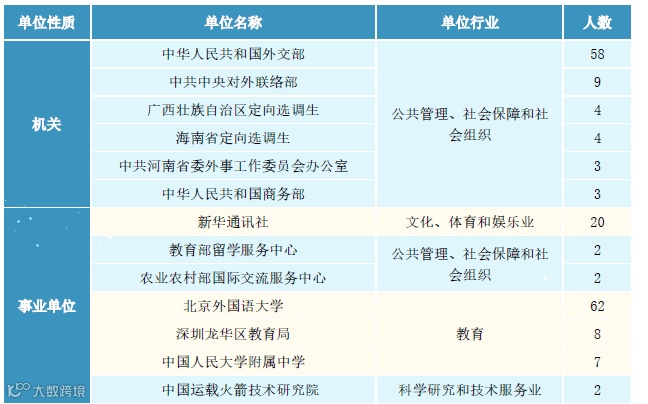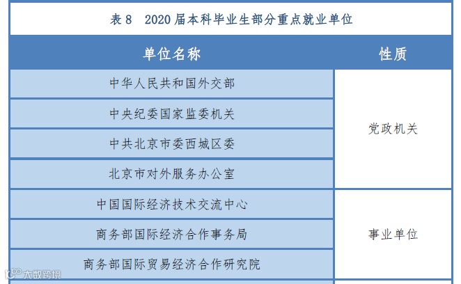 北京也许是体制内工作最多的城市了。外交学院2020年毕业生中进体制的占7成,北京外国语大学有45%的毕业生进入体制,这两所学校都与“外交”有着密切的联系,学生的主要去向都是外交部、国际交流等相关的政府机关单位。据外交学院介绍:当前活跃在外交一线的外交官中,平均每6名中就有1名外交学院毕业生,每4名高级外交官就有1名来自外交学院。