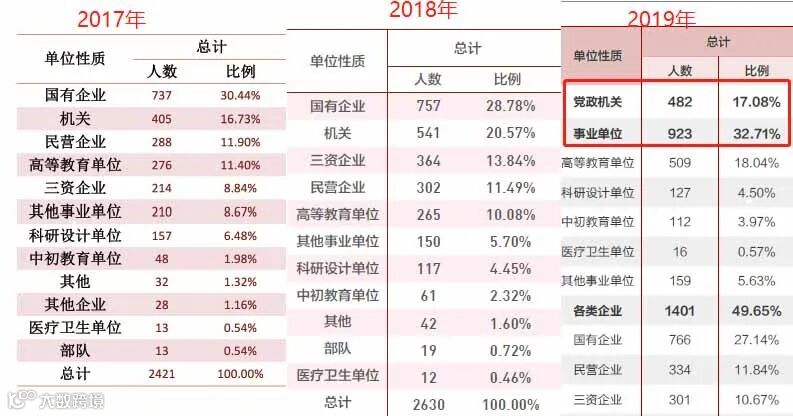 从北京大学近三年(2017-2019年)毕业生就业单位性质来看,去党政机关和事业单位工作的占比已逐渐增加到一半,若再加上国有企业的部分,那么近乎8成的北大毕业生进入体制内。
