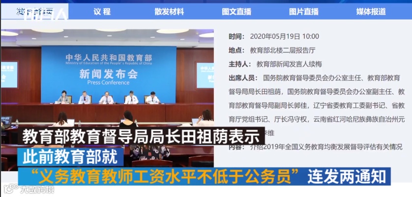 2020年5月的教育部新闻发布会上,教育部教育督导局局长田祖荫表示,年底以前必须完成义务教育教师工资水平不低于公务员,此作为一项硬任务,要求各地开展自查。
