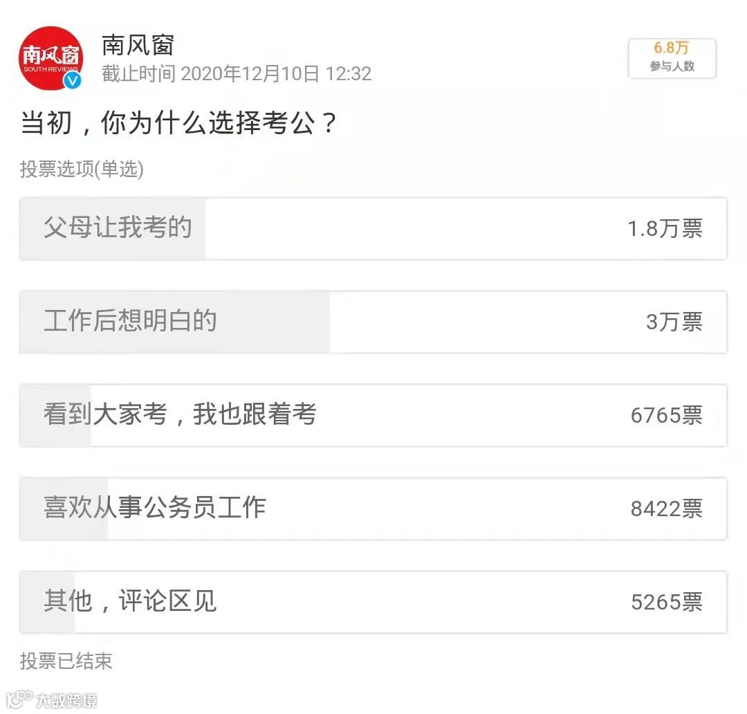 南风窗曾发起“当初你为什么选择考公”的投票,“工作后想明白的”这一选项以3万的票数已远超出“父母让我考的”这一选项。如果说“进体制”曾经是父母对子女的最大期望,那么如今越来越多年轻人正选择主动进入体制内。