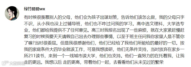 所以就算他们现在可能已经靠着自己的打拼撑起了一个温暖的家,可能不愁吃穿,但是他们依然不希望自己的孩子再走一遍自己又苦又累的老路。