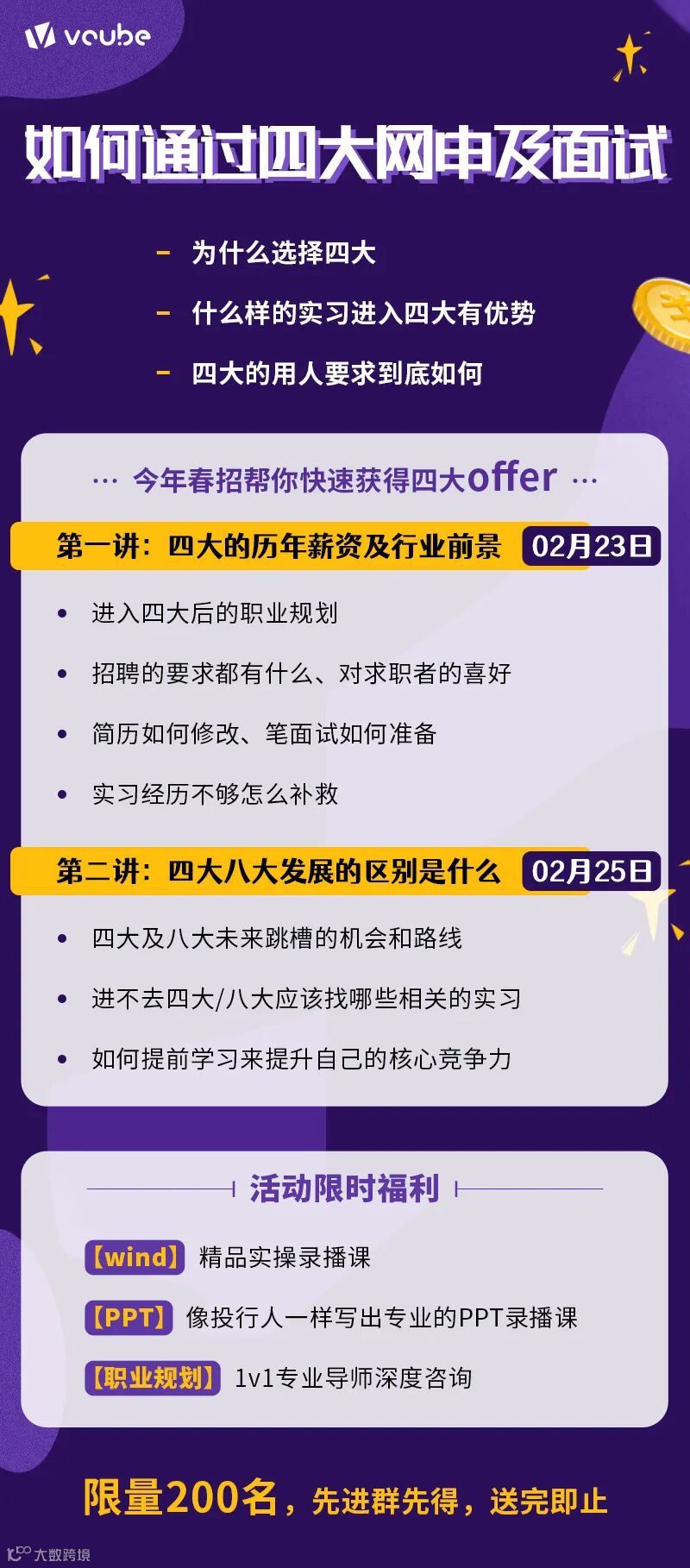 价值立方老师总结出了一套冲刺四大的方法。去年的秋招,我们已经成功帮助了243名同学拿到四大offer。
