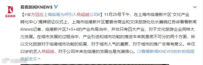1月25号下午,在上海市临港新片区“文化产业孵化中心”揭牌颁证仪式上,上海市临港新片区管委会商业和文体旅游处处长冀晓红告诉看看新闻Knews记者,临港新片区7+5+4的产业布局当中,并非只有四大产业,对于文化旅游企业同样大力发展。在城市发展的过程当中,产业引进和城市功能的推进本来就是密不可分的两个方面,所以文化旅游对于临港城市功能的拓展,对于城市人气的集聚,对于城市的推广非常有意义。年仅22岁的艺人杨超越,对于公司未来在临港的发展也是充满信心。