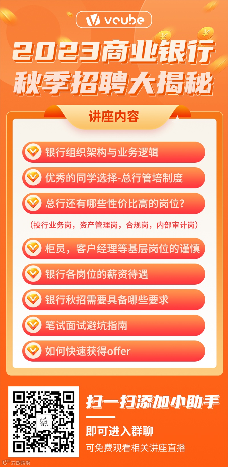 每年秋季9-10 月份,各大商业银行会在全国范围开展多场高校校园宣讲会。宣讲会通常介绍行情行史、企业文化、招聘概况、职业发展等内容。