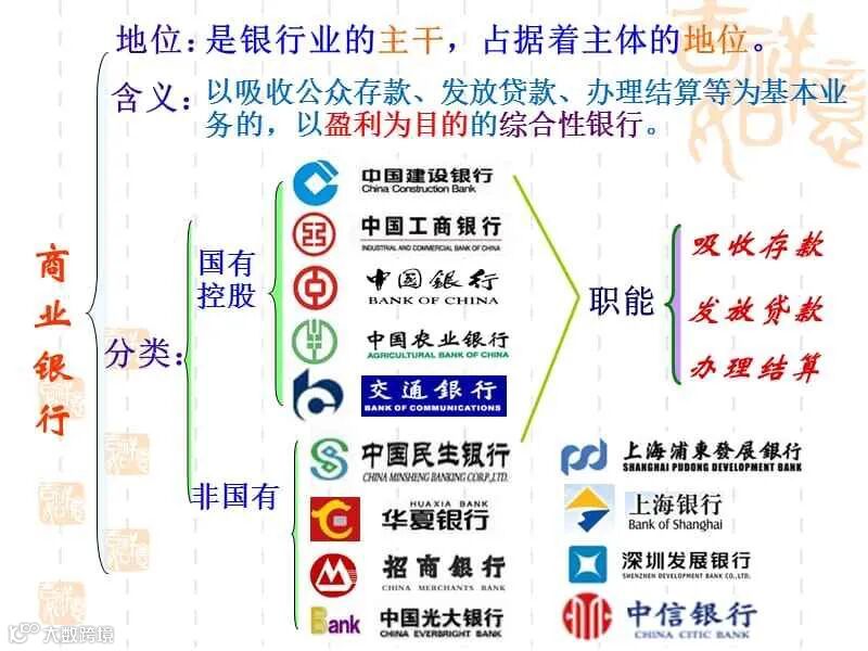 国有六大商业银行——工、农、中、建、交、邮可谓是中国最赚钱的企业,在世界500强中也是榜上有名,其他股份制银行近年来也是蓬勃发展,一些城市商业银行、农村商业银行发展势头也很迅猛。