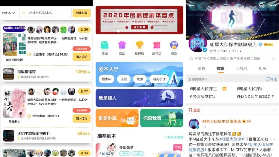 除了在平台内部增加游戏道具、付费剧本频道之外,像“我是谜”在创立三年后进军线下,首页还聚合了狼人杀、谁是卧底、你画我猜等多种社交游戏;“剧本君”增设了“剧本杀版大众点评”的功能,让玩家通过平台约线下面杀;引路人《明星大侦探》也推出了线下的实体旗舰店……