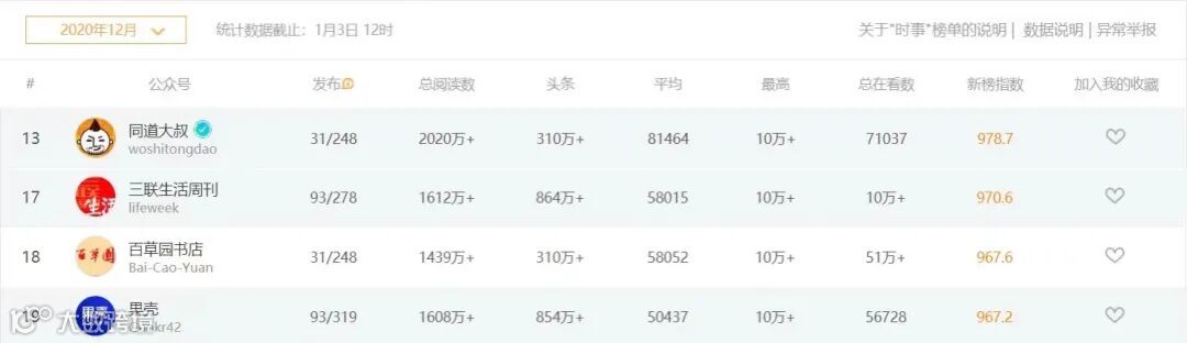 新榜2020年12月月榜总排名,同道大叔更是排到了第13名,超过了三联生活周刊和果壳。