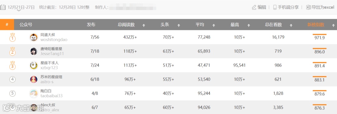 挑了几个大家比较熟悉的星座公众号做了个周榜统计,可以看到阅读量都高的惊人。