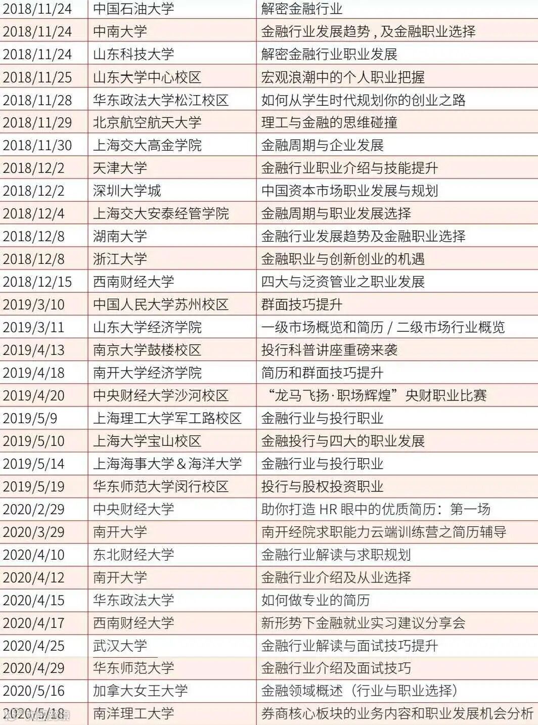 六年公益,百校巡讲,六年来坚持支持各地学校职业发展,每年都会集中数次走进全国各大高校 ,与各校就业中心深度合作,根据学校特色及需求,定制相应的职业分享内容,包括行业大咖讲座、师兄师姐返校分享、校招情况解析、求职技能提升、求职比赛协办等,金融小伙伴是你求职路上的永远陪伴。