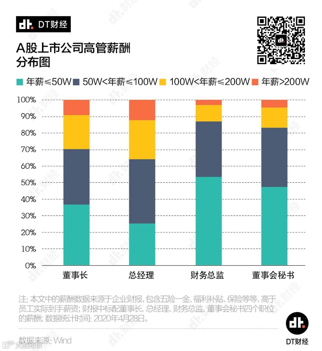 细看不同职位的高管情况,A股财报四个“标配”高管职位中,任一职位年薪达到百万的比例都不超过40%,这说明,