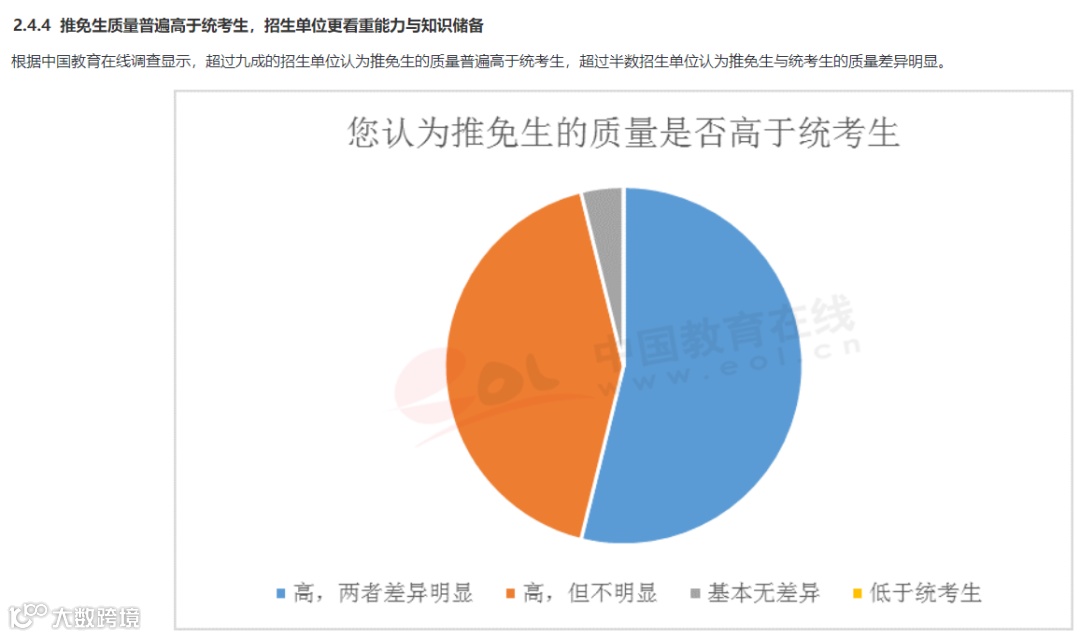 根据中国教育在线调查显示,超过九成的招生单位认为推免生的质量普遍高于统考生,超过半数招生单位认为推免生与统考生的质量差异明显。