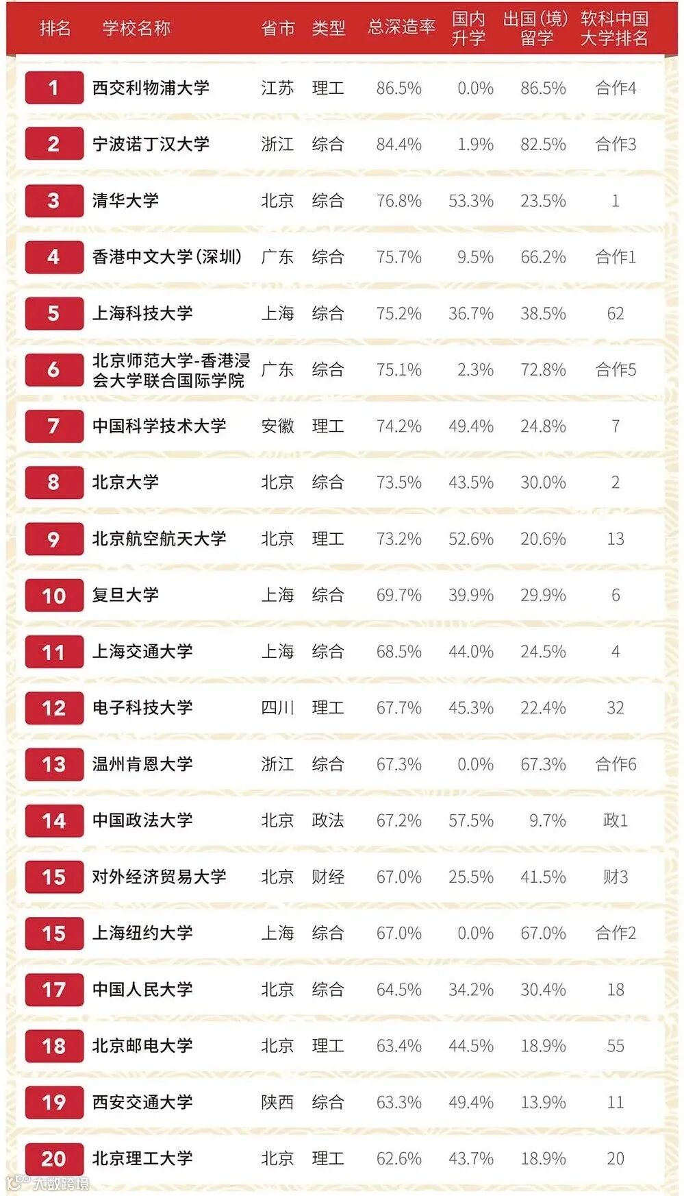 此前,软科发布的2019届本科毕业生深造率排名中,“双一流”高校本科毕业生,将近有12.5%选择出国留学,北外、人大、北大的留学率超过了30%,最高的对外经济贸易大学更是高达41.5%。可见,留学作为一个重要深造途径,原本已经有相当的人群规模。