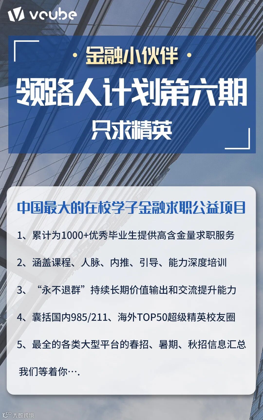 领路人计划第六期仅面向2020.1——2021.6期间毕业的应届生群体,旨在聚集真正优秀的毕业生,无偿助力求职,推动输出和交流,精心打造一个非商业化的金融精英圈。