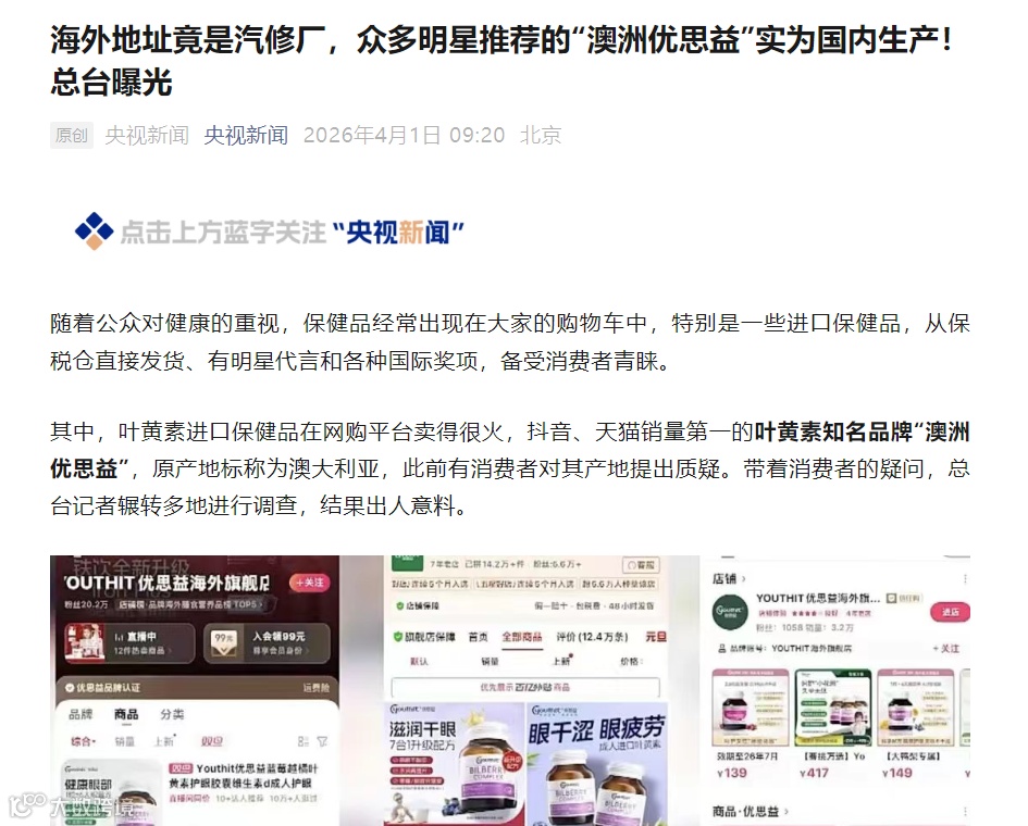 今日,央视新闻曝光了一起跨境保健品行业乱象,知名品牌“澳洲优思益”因涉嫌“伪进口”被推上风口浪尖。