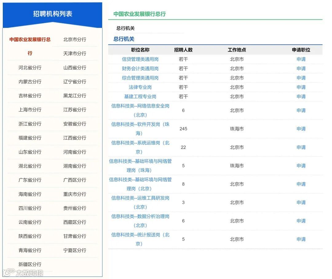 1、招聘单位包括总行机关和省级分行。