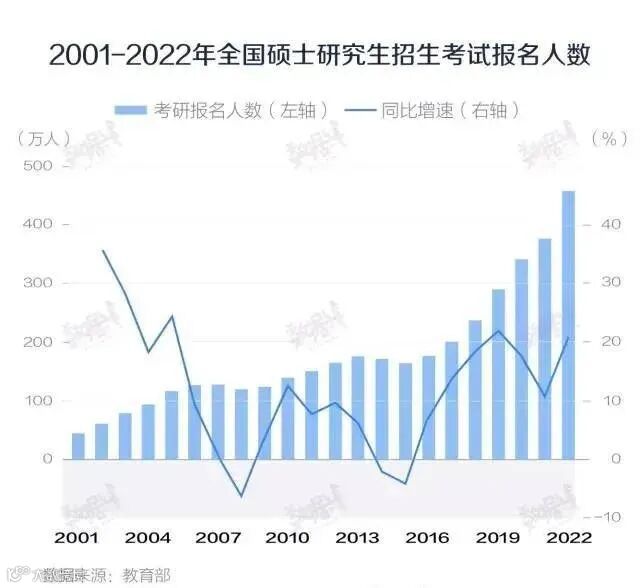 在这样的压力下,选择考研的人越来越多。据教育部,2022年全国硕士研究生招生考试报考人数达457万人,同比增速超两成。