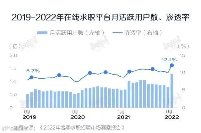 线上找工作的人数也达到疫情以来的新高峰。据《2022年春季求职招聘市场洞察报告》,2022年2月在线求职平台月活跃用户数大幅上涨至1.28亿,渗透率增加到12.1%。