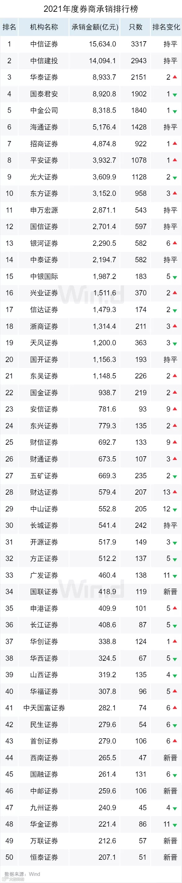 按照Wind口径统计券商总承销金额,中信证券优势明显,以领先中信建投1539.9亿元夺魁,总承销额15634.0亿元,华泰证券排名第三。